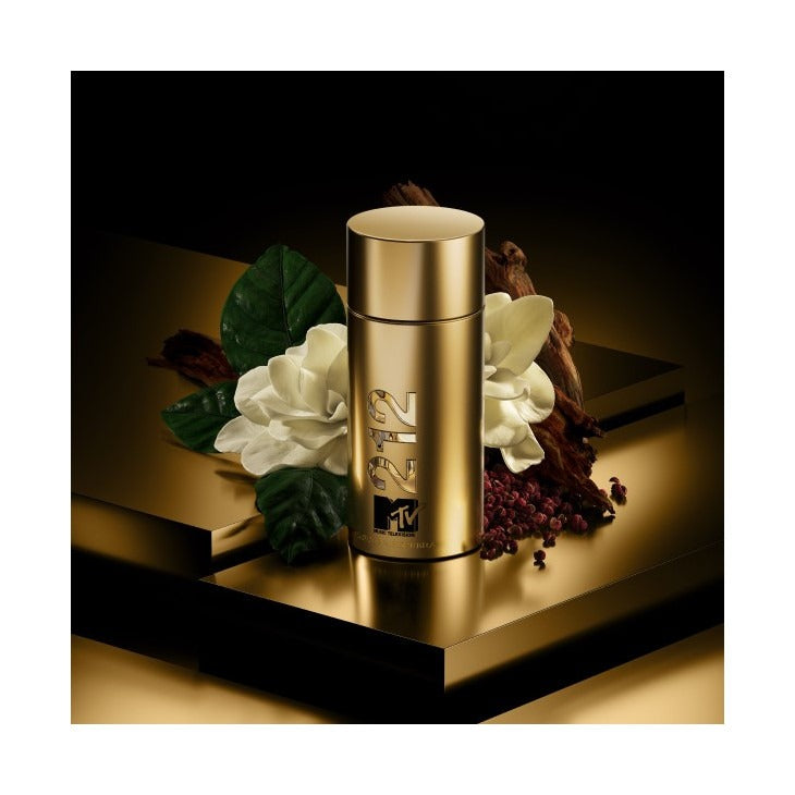 212 NYC MTV for Men, a limited edition fragrance from Carolina Herrera, is a modern, fresh, and woody scent inspired by the energy of New York City and MTV. It combines spicy top notes of cardamom and Sichuan pepper with a floral heart of gardenia and elemi, and a warm, woody base with notes of vibrant woods and tobacco accord. The fragrance is presented in a sleek, gold-colored bottle with the MTV and Carolina Herrera logos, reflecting the spirit of the iconic television network.